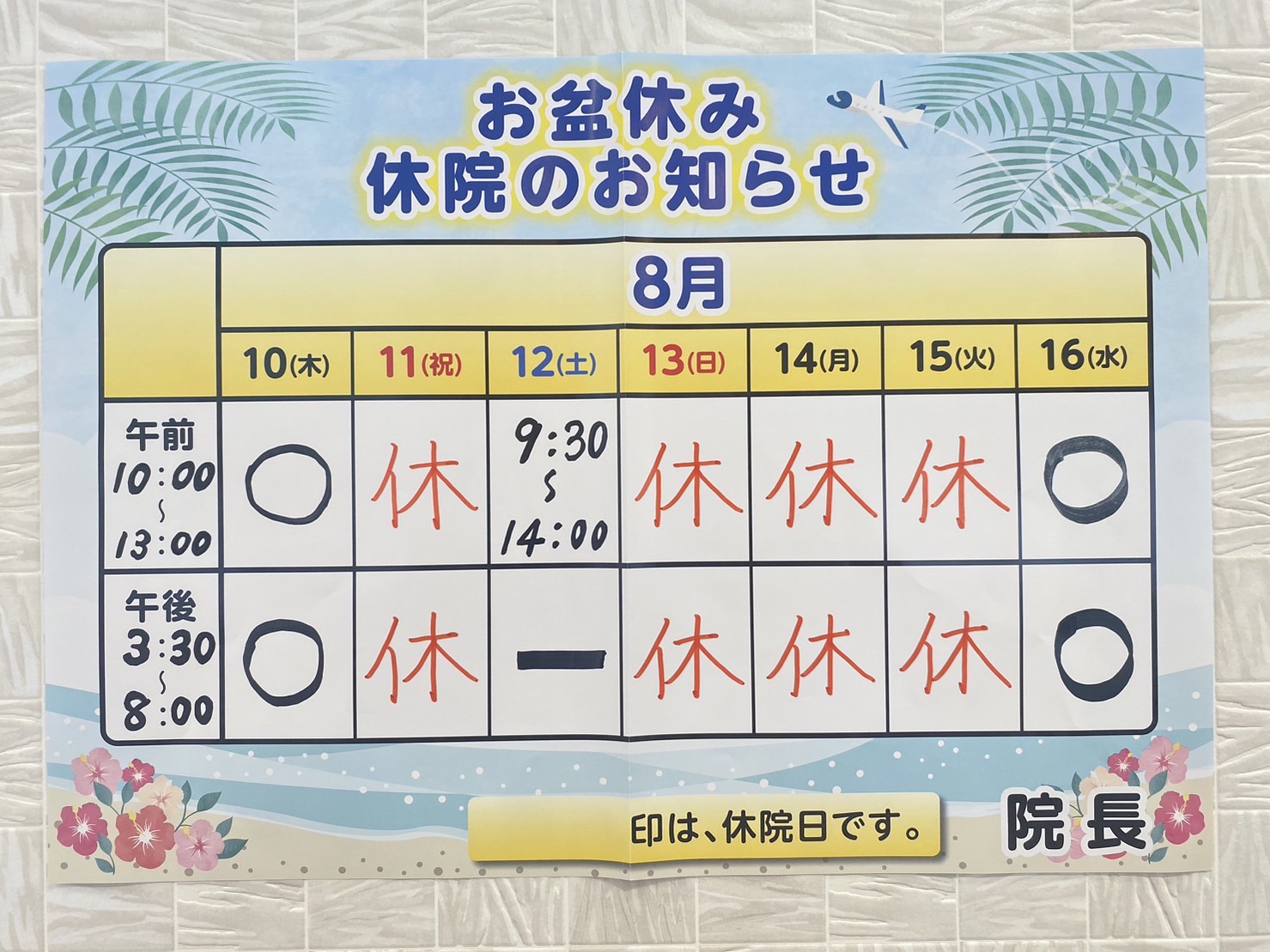 当院のお盆休みは基本休診日の日祝に加え13日14日15日もお休みさせていただきます。