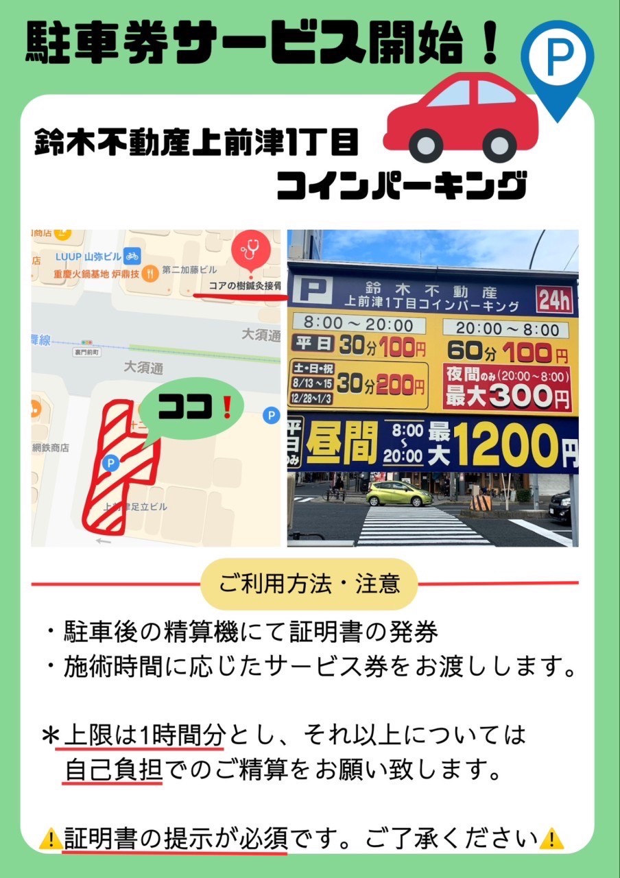 コアの樹鍼灸接骨院も4月から駐車場のサービス券配布が始まりました!!